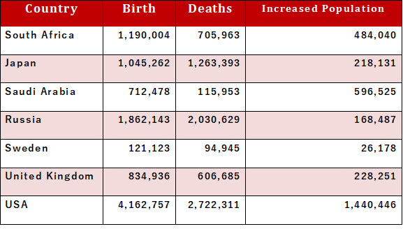 Birth & Death Statistics of Some Selected Countries (2019, in numbers)